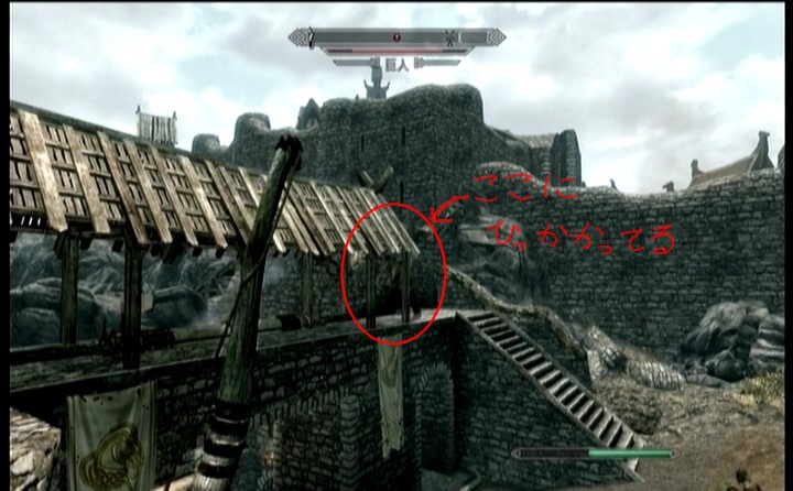 ここは一つ、ホワイトランの衛兵を巻き込んで巨人を倒してやろうと思い、いい場所ないかな~と高台をうろうろしてたら・・・・あれ?巨人が建物に引っかかって止まってる・・・?