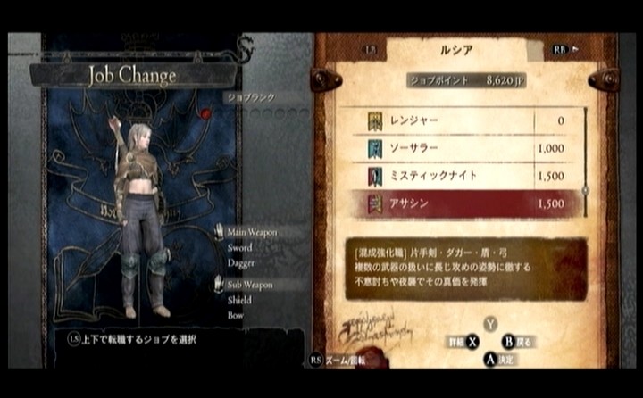 アサシンはダガー、片手剣、弓、盾が使えて、メインにダガーか片手剣を。サブに弓か盾を選べます。