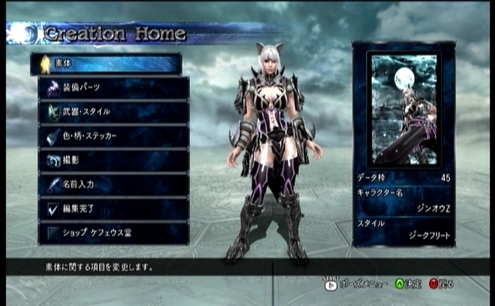 某ハンター、獄狼竜防具バージョン。とにかくこの防具が好きで、見た瞬間に作ろう!と思いジンオウガ亜種を頑張って狩り続けた思い出があります。でも性能は微妙なのでメインで使うには結構無理があったんですよねー(´д`) それで前回のユクモノ防具に続いてこちらで作ろうと思ったのですが、問題は腰の後ろの大きなカバー?みたいなの。最初は「亀の甲羅」で作ろうと思ったら、何故か腰の裏まで届かず断念。結局「こうもりの翼」をぐりぐり動かしまくってどーにかこーにかそれっぽくしたものの、それでもちょっと納得いかない感じ。でも全体的にはそれっぽく見えるようになったのでとりあえず満足。後、髪型もちょっと悩み、最初は「サムライポニー」に「アライグマのしっぽ」を2つ付けてもわっとした感じを作ろうとしましたが、結局、「フェミニンカール」に落ち着き、余った特殊パーツ枠には「兜飾り(英雄)」を2つ使い、腕の赤い炎のような部分にしました。やー、やっぱりこの防具はカッコイイねー(´∀`)