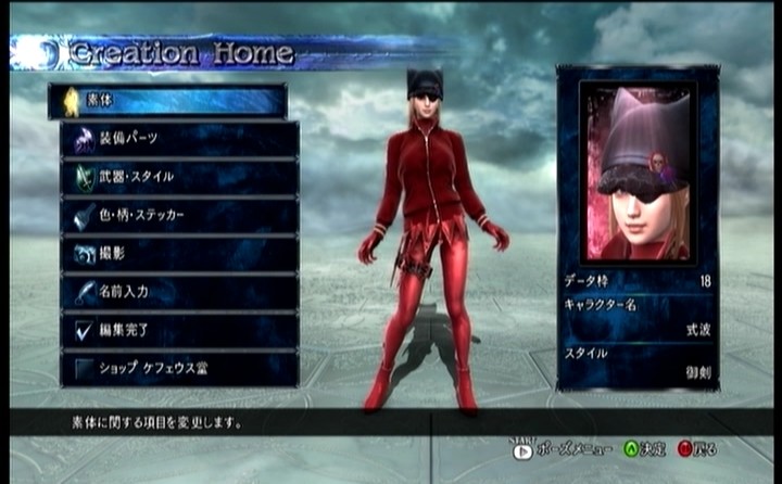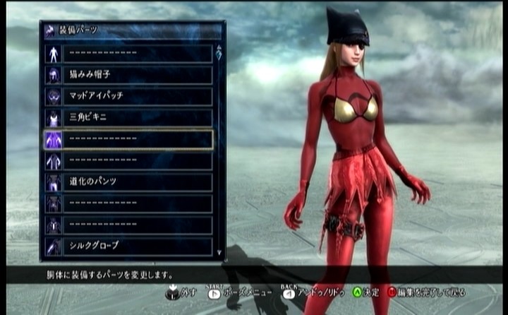 上記の某Qの赤いヒト。この格好はあるシーンでちょっとだけ出てたやつで、帽子が気に入ったので採用。で、その帽子は「猫みみ帽子」だけだとツバの部分がないので、「亀の甲羅」をくっつけて作りました。地味に頑張ったのがその帽子についてるバッジで、記録集のキャラ絵とにらめっこしてなんとか骸骨と丸?のバッジを作成。しかし一番苦労したのはプラグスーツの色。通常、体に張り付く感じの服には赤い色が配色できないのでどうしようかと試行錯誤してたら、唯一、「道化のパンツ」だけが赤い色が使えると判明。腰についてるスカートみたいなのが邪魔でしたがここは妥協。防具破壊後は上半身もプラグスーツになるのでこちらも色で苦労しましたが、ステッカーを地肌に貼る事で強引に作成。色々妥協したので完成度が低めなのが残念です。