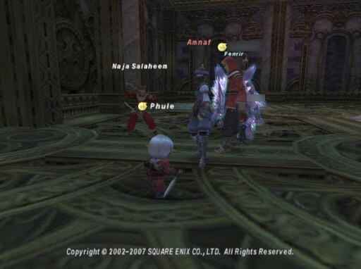 4戦目。編成はそのままで、戦う場所をマラソンをやってる近くでやる事により、ナジャが青魔道士を殴らないようにします。これが上手くいき、何人か死者を出しつつもかろうじて最後のイカ魔道士戦に突入!