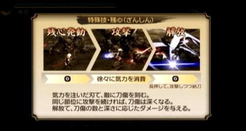 太刀は・・・モンハンのヤツっぽいですが、それプラス、大剣の溜め攻撃があり、更に「残心」という特殊でちょっとかっこいい技もあります。