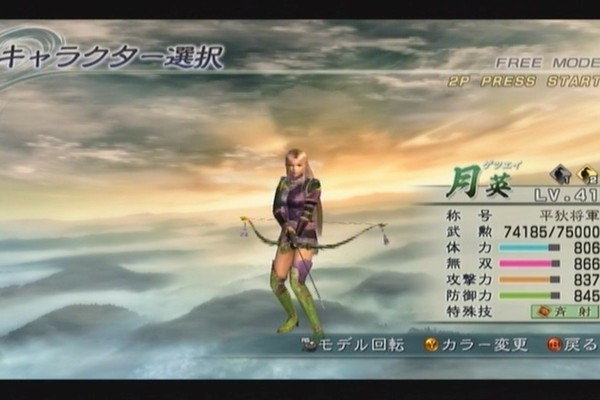 月英 : 孫尚香と同じ弓で、攻撃モーションも同じ。ただ無双乱舞のフィニッシュが少し違います。それと月英の2Pカラーはちょっと変わっており、なんというか・・・・・エルフ?(*'-')