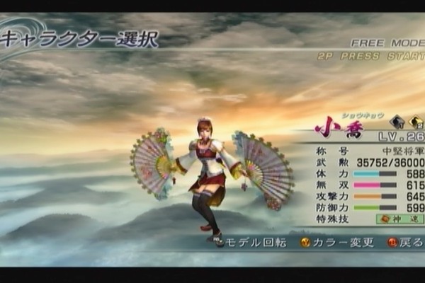 小喬 : 扇の二刀流。最初はとにかくリーチが短いし、技も使いにくいのでかなり弱い。連舞が上がれば最終的にすごい攻撃範囲になるが、それまでが辛すぎ。ちなみに2Pカラーはなんかメイドっぽい。