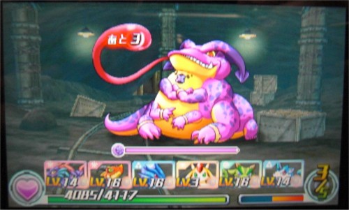 敵の強さ自体もそうですが、パズル玉?が4色(火、水、木、回復)から5色(火、水、木、光、回復)になって、連鎖が少し難しくなったんですよね(´Д`;)ヾ