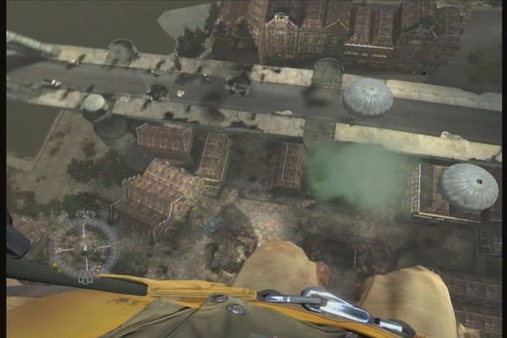 空挺師団とあって戦闘開始はパラシュートによる降下より始まります。この時、マップ内ならどこにでも降りる事ができ、いきなり敵陣の真っ只中に降下する事も可能。まあ、下手な場所に降りたら蜂の巣にされちゃったりしますけどね┐(´ー`)┌